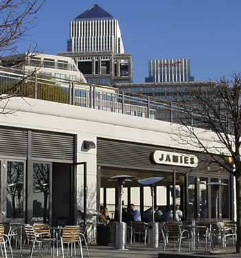 Jamies bar is next to the Thames (Lower Aberdeen Wharf) under the Westferry Circus roundabout and gardens. Follow this link for a printable map from Streetmap. |